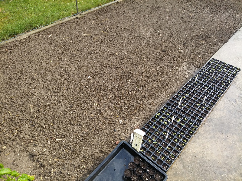 Hier waren Erdbeeren seit letztem Sommer drin, 4-6 mal gehackt, nach der Ernte umgegraben und mit dem Krail zerkleinert, festgedrückt. Hier sind die Krümel, auch die kleinen, noch als solche erkennbar.