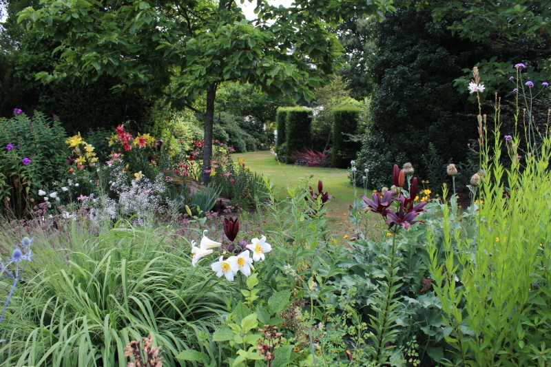 Blauraute ist super. Bei mir ist es Blue Spire, etwas erhöht gepflanzt wirkt sie gleich mannshoch. Im Spätwinter weit zurückgeschnitten, erreicht sie im juni juli erst wieder ihre größe und überlässt vorher anderen die show.