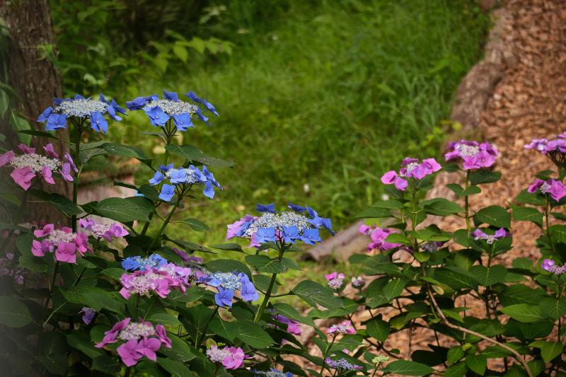 Ein besonderes 'Blau' zeigte die vermeintliche Hydrangea 'Blaumeise' mit ihren dunklen Stielen auch in den ersten Standjahren. Inzwischen blüht sie nur noch rosa; aber ich möchte da gar nicht unbedingt nachhelfen wegen des Farbtons. Vielleicht erfahre ich per Zufall mal ihren richtigen Namen.