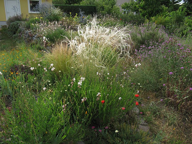Vorn links ist das Wiesenbeet und dahinter der Steingarten, rechts ist Wiese.