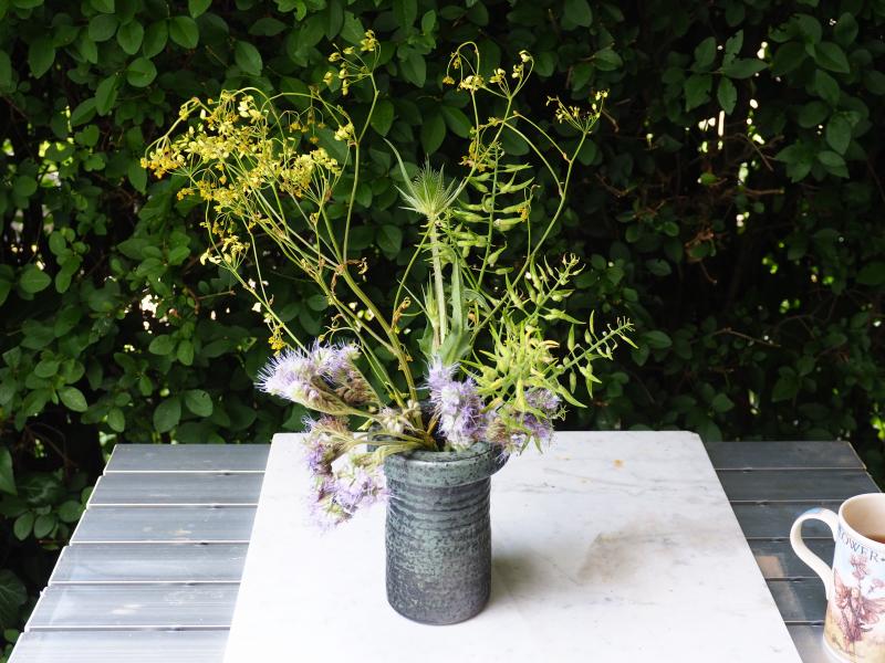 Dipsacus laciniatus hatte ich mitgebracht. Alles andere kam aus dem großen Pool. Phacelia kannte ich, eine Apiacea und eine Brassicacea konnte ich nicht bestimmen. Vielleicht helft ihr mir? Zu diesen Pflanzen hatte ich noch Schwertlilienblätter in Stücke geschnitten und als Bühne in den Vordergrund gesteckt. Keiko Nimura-Eckert meinte schmunzelnd: "frisch".