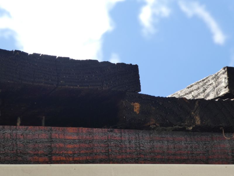 Ich habe das Tier dann mittels einem alten Handtuch hochgenommen und ins Freie entlassen. Eine Kontrolle der Fensterbänke zeigt übrigens, dass sie die gut sonnenbeschiene südöstliche Seite bevorzugen (= die Seite, in denen es im Sommer immer tierisch warm wird.) Die Fassade besteht aus sägerauen Douglasienbrettern, die auf eine Hinterlattung genagelt sind. In der Fassade bauen manchmal Hornissen und Wespen, nisten Baumläufer und unterm Dach Feldsperlinge und natürlich das Eichhörnchen, das aber gerade auf Wanderschaft zu sein scheint. So sieht es über den Fenstern aus.