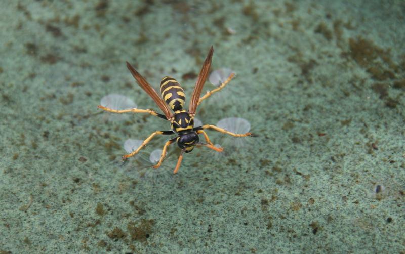 Mein Bild ist eine Feldwespe, die in einer Vogeltränke steht und Wasser aufnimmt. Sie steht das wie ein Wasserflugzeug. Erstaunlich.