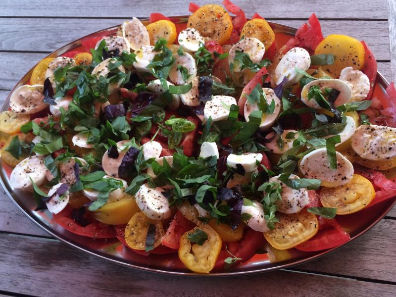 Bei uns gab es gestern den ersten großen Tomaten Salat aus eigener Ernte. Mit Büffel Mozzarella, dreierlei Basilikum Sorten, Olivenöl und Salz. :)