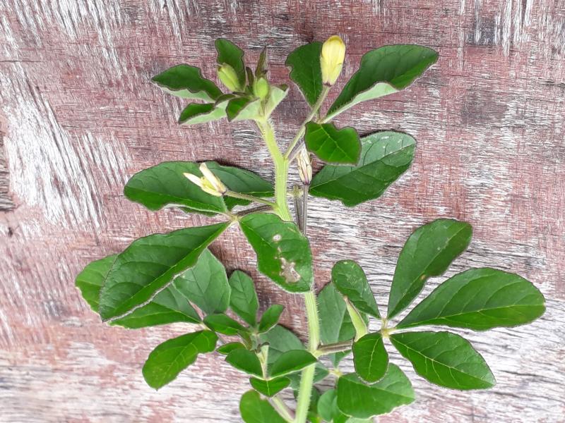 Das hier stammt wahrscheinlich aus einem Substratbestandteil, trotz der untypischen Blüte (sie scheint nicht weiter zu öffnen) vermutlich ein Schmetterlingsblütler!? Etwas mit dem Bockshornklee nahe verwandtes?
