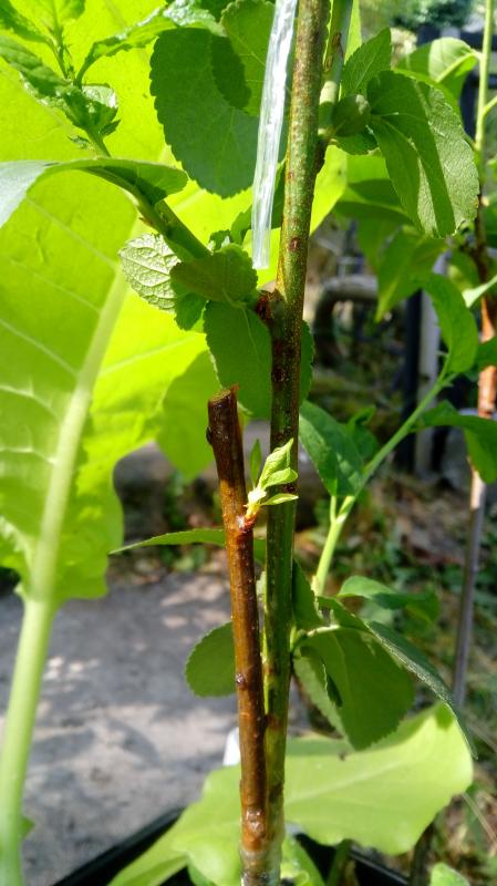 Die Neutriebe der ersten abgebrochenen Veredelung wurden auf die schnelle an eine Kirschpflaume per Spaltpfropfung veredelt. Blätter wurden entfernt. Ich weiß noch nicht, ob die Triebe mit Wachs vor Vertrocknung, überschmiert werden sollten. Mal gucken. Bild von heute.