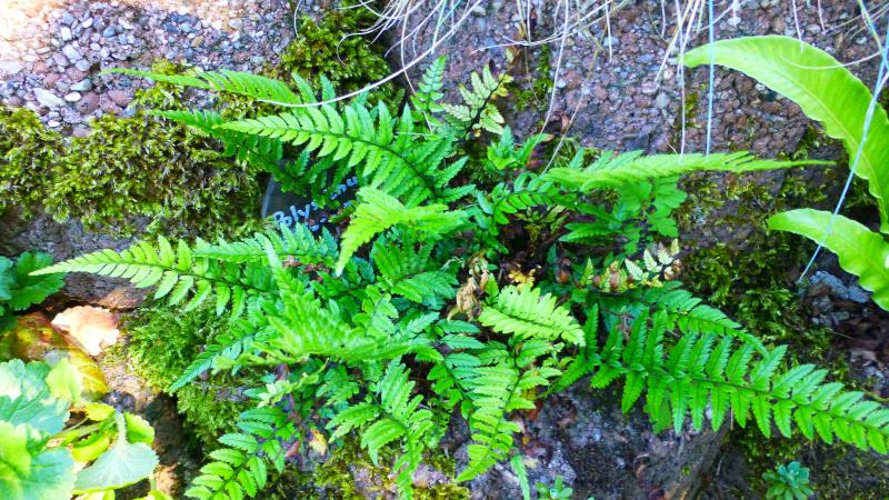 Der Woodwardia unigemmata bildet an der Auflagestelle auf dem Boden bei drei Wedeln offenbar Brutpflanzen. Seltsamerweise wachsen die in Richtung Down Under, es bilden sich keine Wurzeln am Boden, sonder offenbar neue kleine Farnwedel, die aber nach unten wachsen.