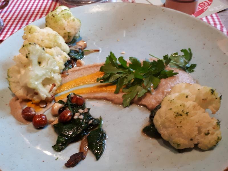 Gebackenen Blumenkohl mit zweierlei Gemüsepüree und Haselnussspinat.