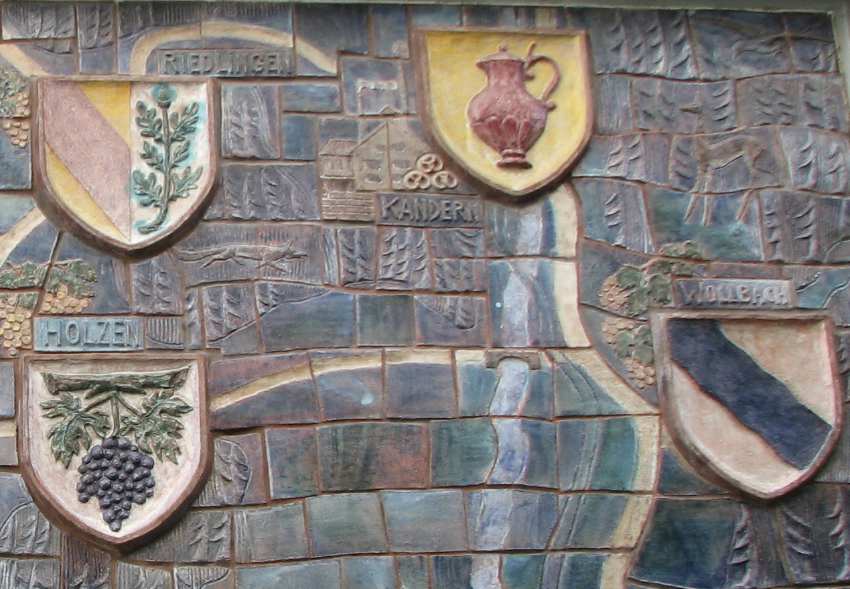 StadtwappenAuszug aus einer Keramik-Wandtafel, die an der Wand der Sparkasse angebracht ist, die sowohl das Wappen Kanderns als auch ein Teil der inzwischen zu Kandern gehörenden Gemeinden aufzeigt.