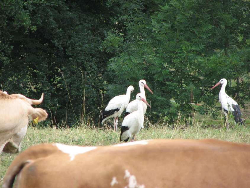 Nicht alltäglicher BesuchDiese Kühe mögen ganz schön gestaunt haben, als plötzlich insgesamt acht Störche auf ihrer Weide aufgetaucht sind. Aber es herrschte friedliche Eintracht.