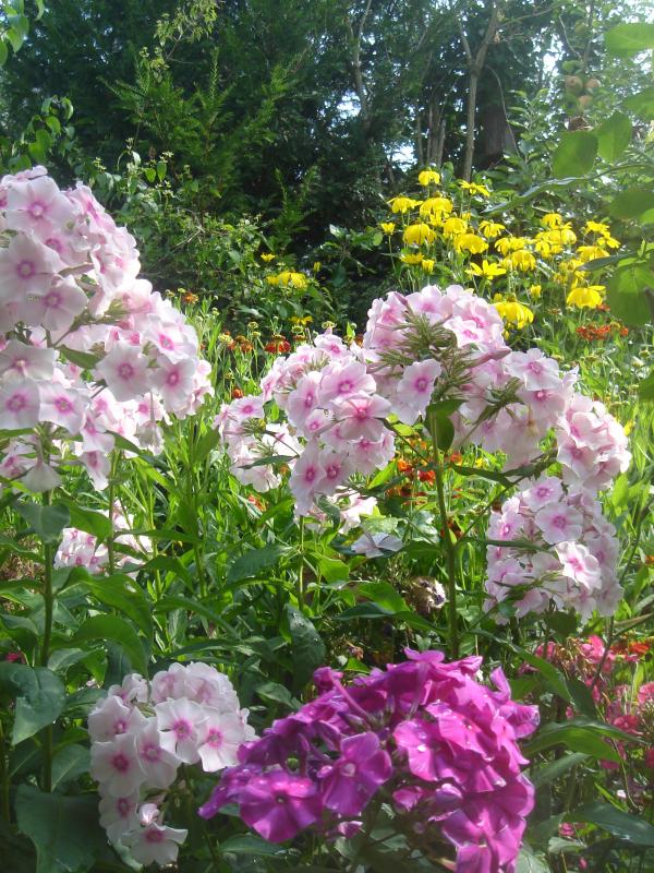 Dreiklang von Phlox , Monarde, Fallschirmrudbeckie, derweil der Wein die Königskerze´als Rankhilfe mißbraucht.