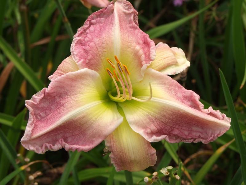 'Jerry's Whirliggig'der alte Riesenflatschen macht zeitweilig ganz gute Blüten,manchmal sehen sie auch seltsam schlapp aus.Wenn sie verblühen,hat man viel matsch auszuputzen.Das ist ein echter Nachteil bei solchen Monsterblüten.