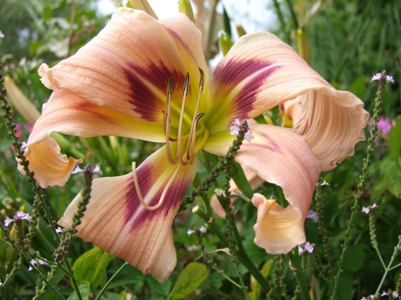 'Jerry's Whirliggig'der alte Riesenflatschen macht zeitweilig ganz gute Blüten,manchmal sehen sie auch seltsam schlapp aus.Wenn sie verblühen,hat man viel matsch auszuputzen.Das ist ein echter Nachteil bei solchen Monsterblüten.