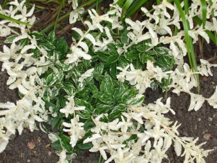 Bin mir total unsicher aufgrund der weißen Blätter an den neuen Trieben. Das Bild wurde Juni 2006 aufgenommen. Ich tippe auf die Sorte 'Emerald Gaiety'. Oder was könnte es sonst sein? Wer kann mir helfen?