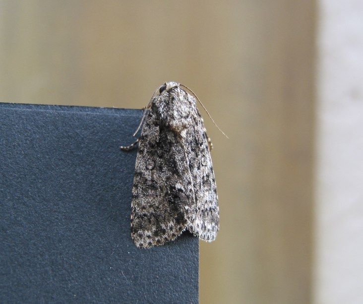 Ahorneule Acronicta aceris L.Etwa 2 cm lange Vorderflügel. Graubraun, auch grauschwarz, die hellgefüllte Ringmakel dunkel gekernt, schwarze Wurzelstrieme auffallend, die Hinterflügel sind fast weiß.Kleiner Falter, der - laut Literaturangaben - recht häufig sein soll. Als unscheinbarer Nachtfalter wird er jedoch kaum wahrgenommen.Seine Raupe sieht spektakulär aus und wird im Spätsommer gefunden.