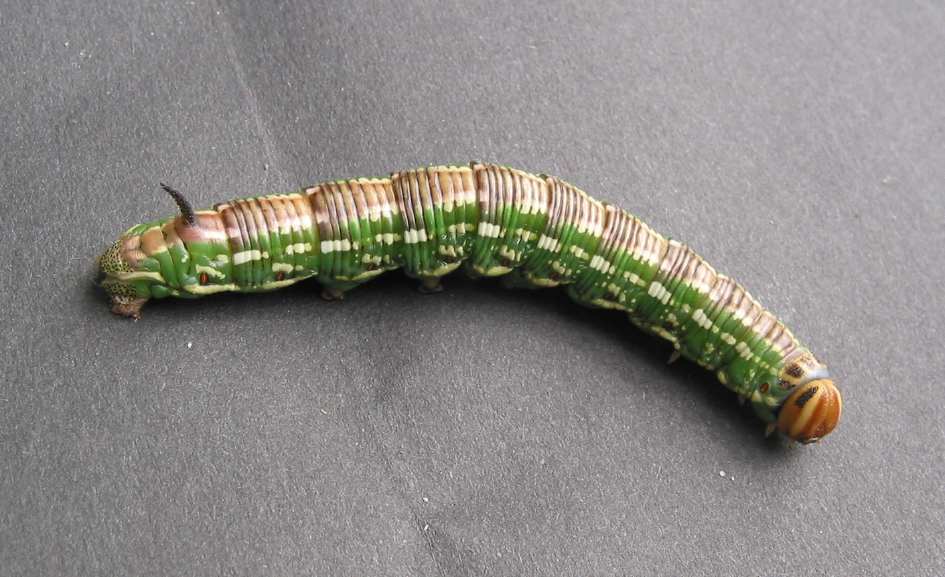 Kiefernschwärmer oder Tannenpfeil Raupe Hyloicus pinastriIch fand die Raupe des Kiefernschwärmers im Gras und habe sie wegen des Kontrastes auf schwarzes Tonzeichenpapier laufen lassen und nach dem Fotografieren wieder auf einer Fichte abgesetzt. Hoffentlich bleibt sie in sicherer Höhe, denn unser Gastkater hat sich schon für sie interessiert.