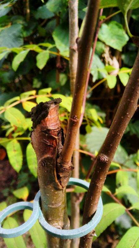 Erste Sommerveredelung mit halberholztem Reisern. Hier, Mispel auf Eberesche. Mein zweiter Versuch. Die Reiser stammen von meiner Mispel-auf-Scharlachweißdorn-Veredelung. Sie wachst so gut, bei einem sehr flachen Winkel, dass ich die Triebe lieber gekürzt habe, bevor mir die Veredelung abbricht.