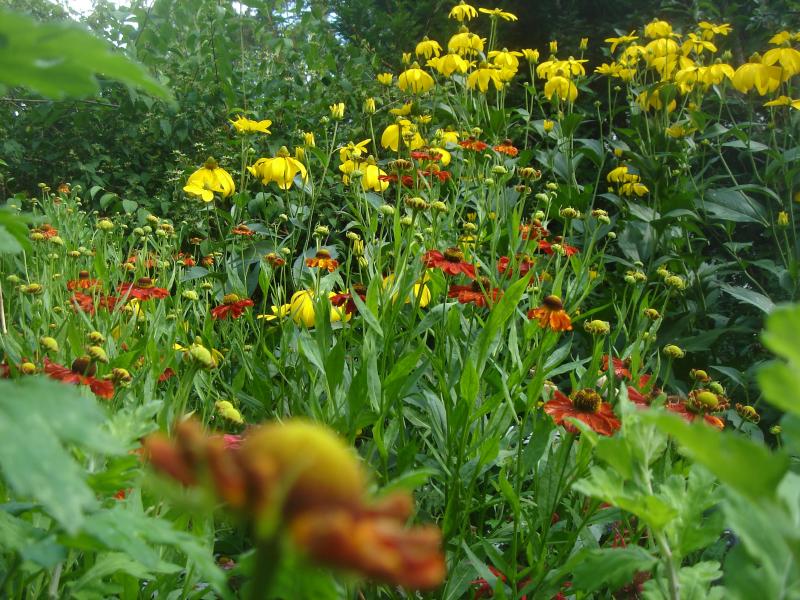 Dreiklang von Phlox , Monarde, Fallschirmrudbeckie, derweil der Wein die Königskerze´als Rankhilfe mißbraucht.