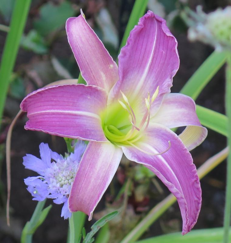 Heute Morgen zeigte sich ein Sämling aus einer Reihe von Kreuzungen mit Spätblühenden - er scheint sich gut mit den Skabiosen zu verstehen :)