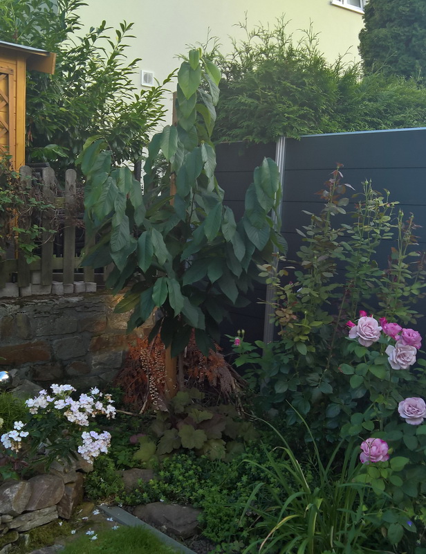 Meine langjähriges Sorgenkind, Pawpaw Mango. Sie büßte den Leittrieb ein, als die Zeder gefällt wurde und hat erst im letzten Jahr überhaupt einmal im Wachstum zugelegt. Dieses Jahr übertrifft sie all meine Erwartungen. Im Herbst wird dann ein Bestäuber und eine weitere Pawpaw einziehen *freu* Ich liebe sie allein schon wegen ihres Wuchses und der großen Blätter. Die Prima wird im selben Beet zwischen den Rosen landen. Ich hoffe auf ihren Schatten in den nächsten Jahren, wird ja wohl nicht besser mit den heißen Sommern. Da brauchen die lila Rosen mehr Schutz. Hinten im Eck mein Minitotholzhaufen.