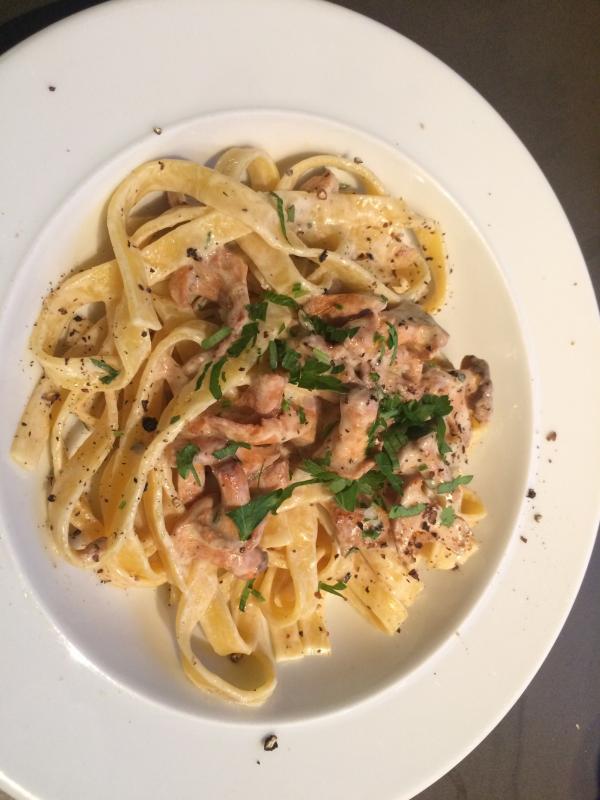 Mein gekippter ::) und zu hell fotografierter Teller beinhaltet Tagliatelle mit Pfifferlingen.
