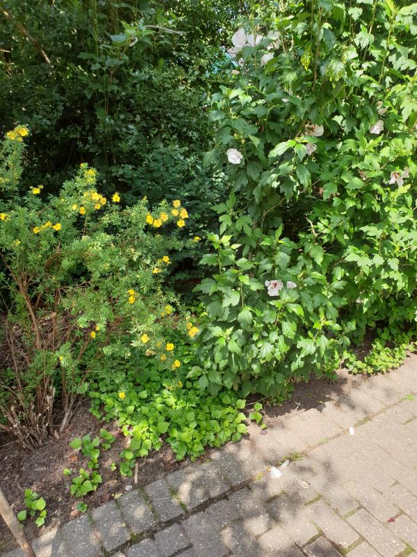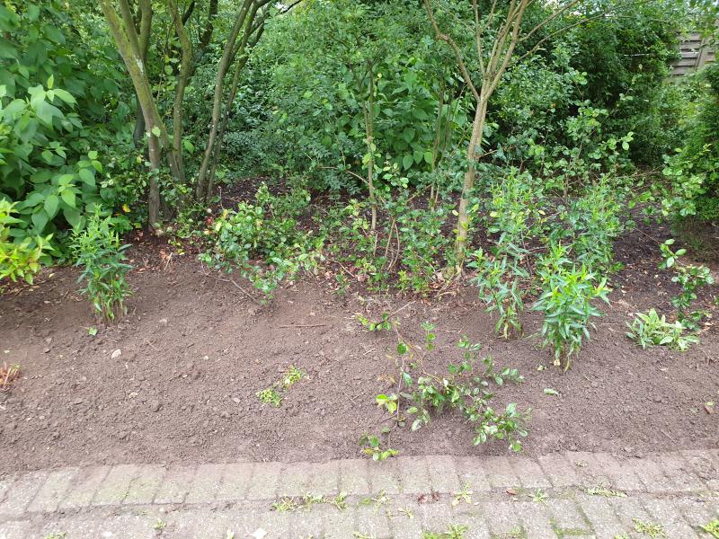 Die meisten der der Ecken wo jetzt Stauden stehen waren von einer Mischung aus Brennnessel Ackerwinde und Symphoricarpos zugewuchert. So wie diese Ecke auch. Hier haben auch einige Spenden einen neuen Platz gefunden. Vor einer Zierquitte die komplette überwuchert war.