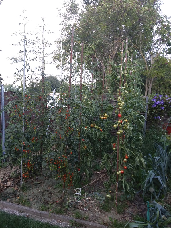 Zum letzten mal für dieses Jahr Tomaten angebunden. Die Stangen sind fertig, Tomaten bis 3,7m hoch, jetzt lass ichs wachsen und geize auch nicht mehr aus. Was jetzt noch kommt darf überhängen.