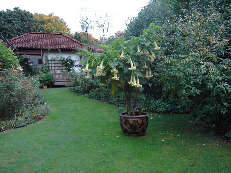 Fünf weitere "Engel" mit ungefüllten gelblich-rosafarbenen Blüten stehen verteilt im Garten in Töpfen, auch auf dem Garagendach.
