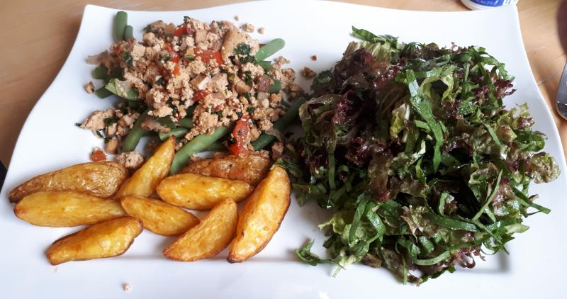 Gestern Kartoffelspalten mit grünen Bohnen und Tofu-"Rührei", dazu Salat aus Raddicchio und Lollo rosso