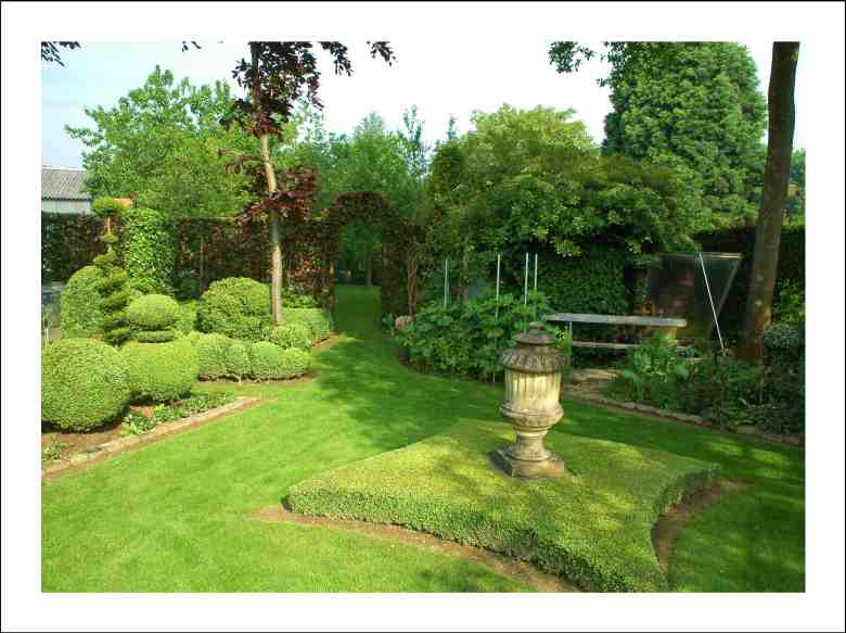 Im hinteren Teil des Garten steht auch noch eine schöne Steinurne auf einem Buchsspiegel. Hier sind auch noch weitere Riesenexemplare von gerettetem Buchs zu bewundern.