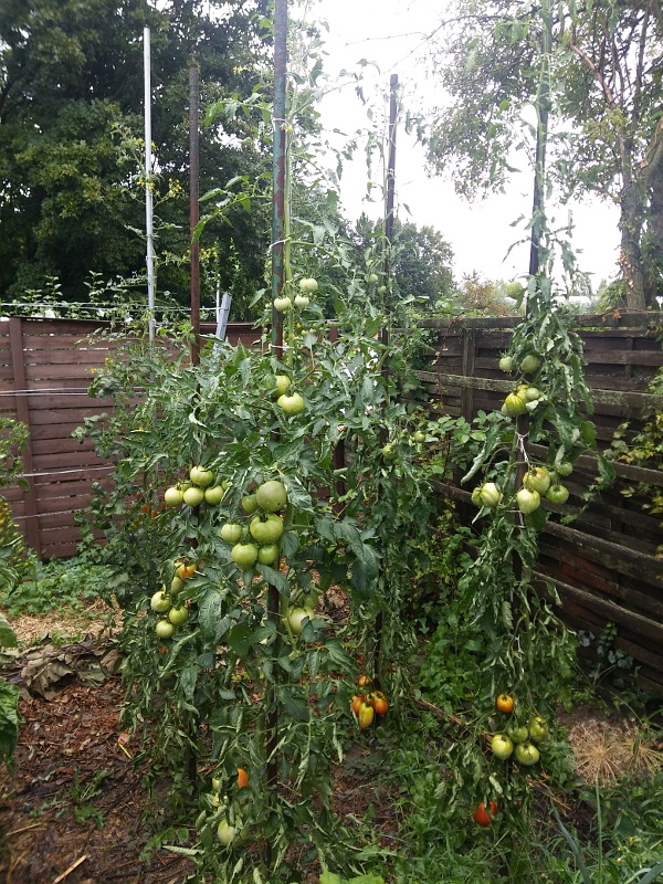 Der Vorteil dieser Sorte ist, dass sie wüchsig ist und gut ansetzt. Ich glaube kaum dass es Sinn macht Sorten in kühlen Gegenden anzubauen, die sich nach 1,2m selbst kastrieren und mit Vitalität aufhören. Im Foto rechts die beiden mit dem hängedem Laub. Foto Ende Juli.