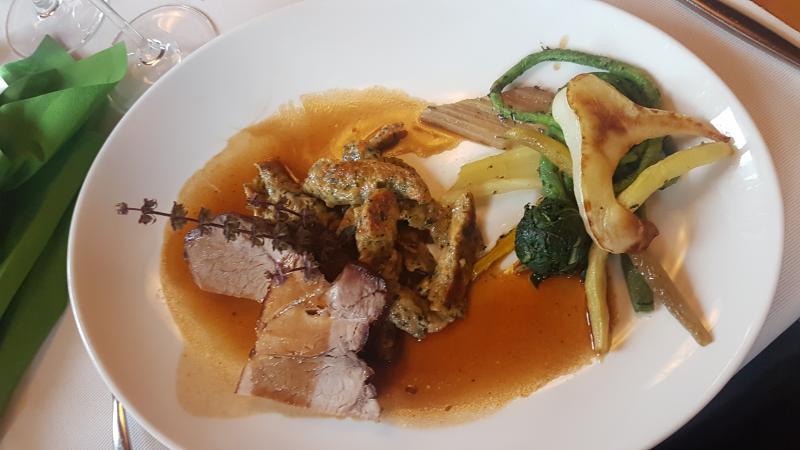 Braten vom.Bioschwein mit Pizokel diversen Bohnen 3 erlei Krautstiel und Patisson