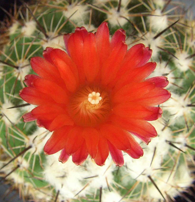 Eine weitere Rebutia, sie trägt ein rotes Blümelein an ihren putzigen Stachelwirbel.