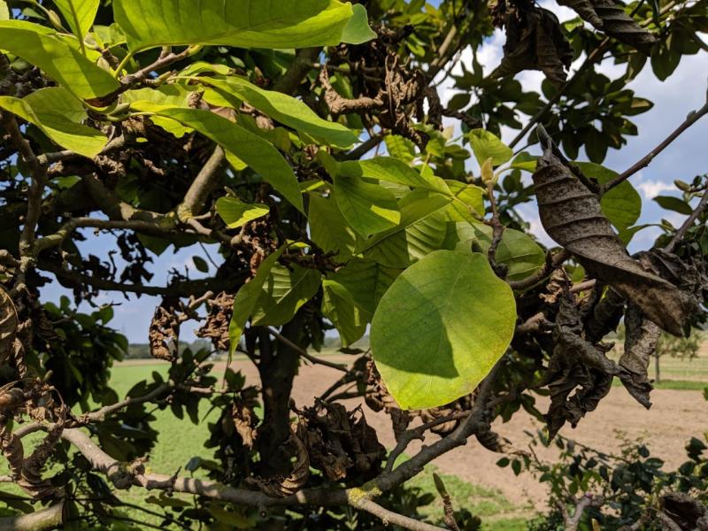 Die Äste mit den vertrockneten Blättern zeigen im Querschnitt keinerlei Verfärbungen, die auf eine Pilz- oder Bakterieninfektion hinweisen. Vielleicht doch ein Schutzmechanismus der Magnolie bei großer Hitze?