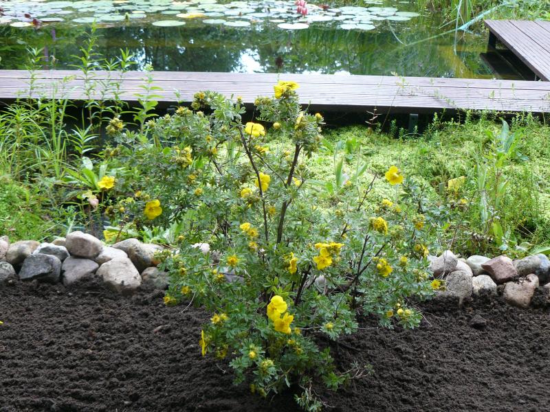 Potentilla fruticosa Goldteppich mit seinen filigranen Blättern passt sehr Gut zum Moorbeet finde ich .