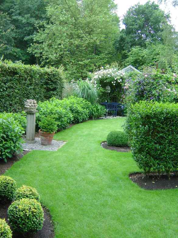 Auch hier ein grasgrüner Rasen, kräftige Pflanzen, die Hortensien in den Startlöchern und ganz hinten, da sieht es doch wieder nach etwas zum Sitz...