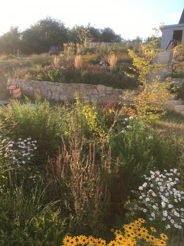 Man vermutet nicht, dass es sich um einen komplett neu angelegten Garten handelt. Die herbstlich blühenden Beete wirken schon sehr stimmig und eingewachsen nach der relativ kurzen Zeit und der Ausblick in die weite Landschaft ist grandios. Du hast es schön, Stefagarten!