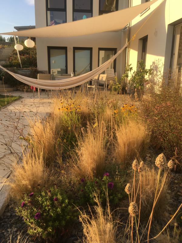 Wunderbare Spätsommerimpressionen! Um die leuchtenden Gräser beneide ich Dich; irgendwann muss ich mir auch mal welche zulegen, aber im Moment ist alles noch ein wenig im Fluss, da kann und will ich nicht zuviel für Pflanzen ausgeben. Und es beruhigt mich auch ein wenig, dass in Deiner Natursteinmauer ebenfalls ein paar Kreuzfugen zu sehen sind, das ist wirklich gar nicht so einfach, die zu vermeiden, wenn kein Stein dem anderen gleicht. ;)
