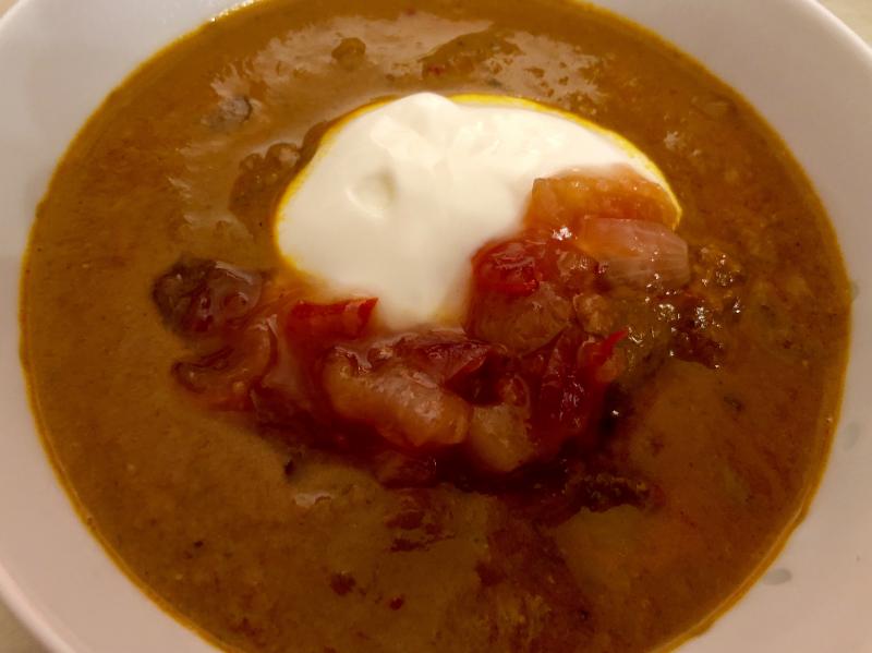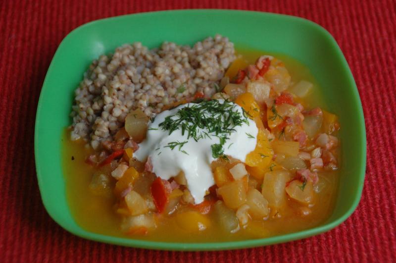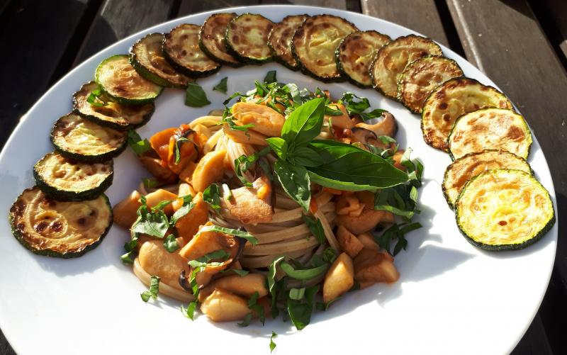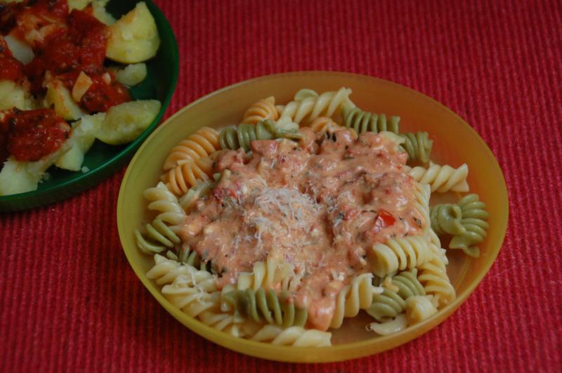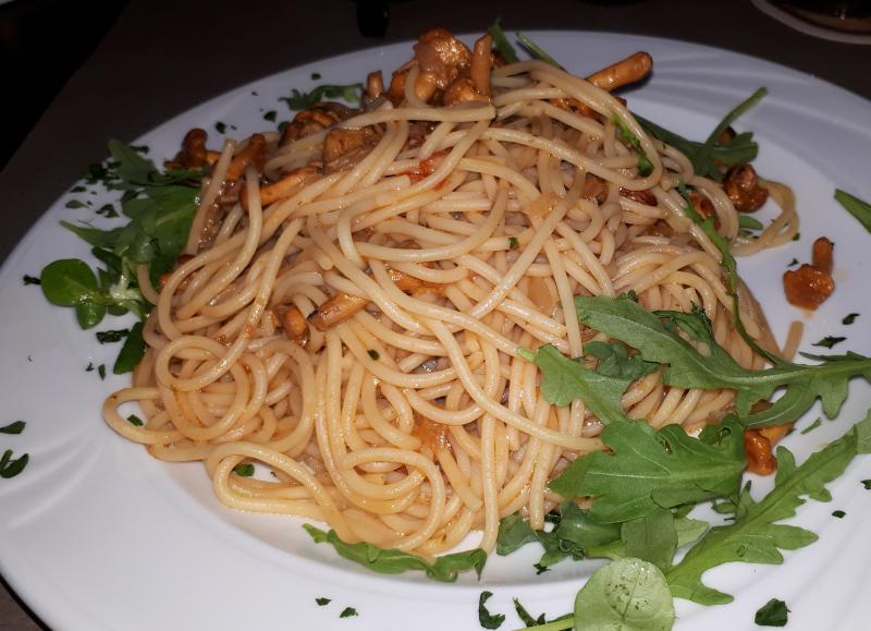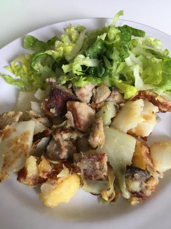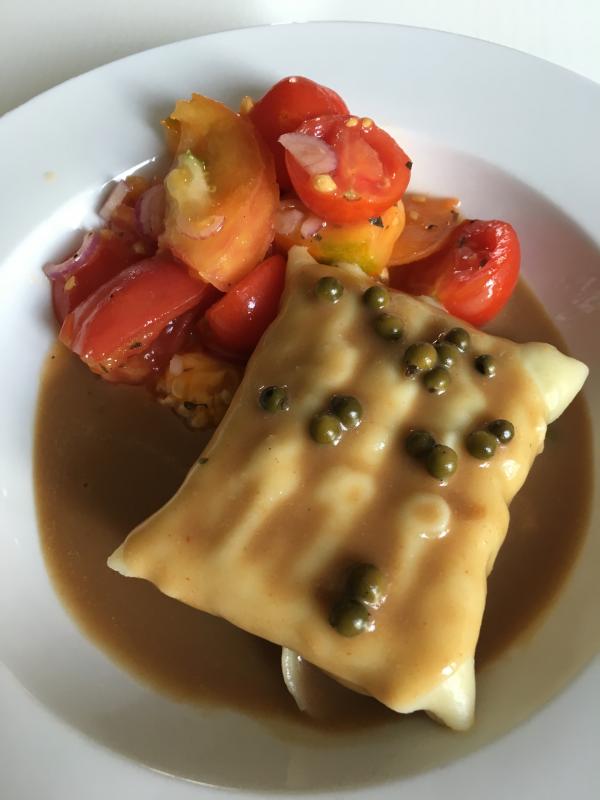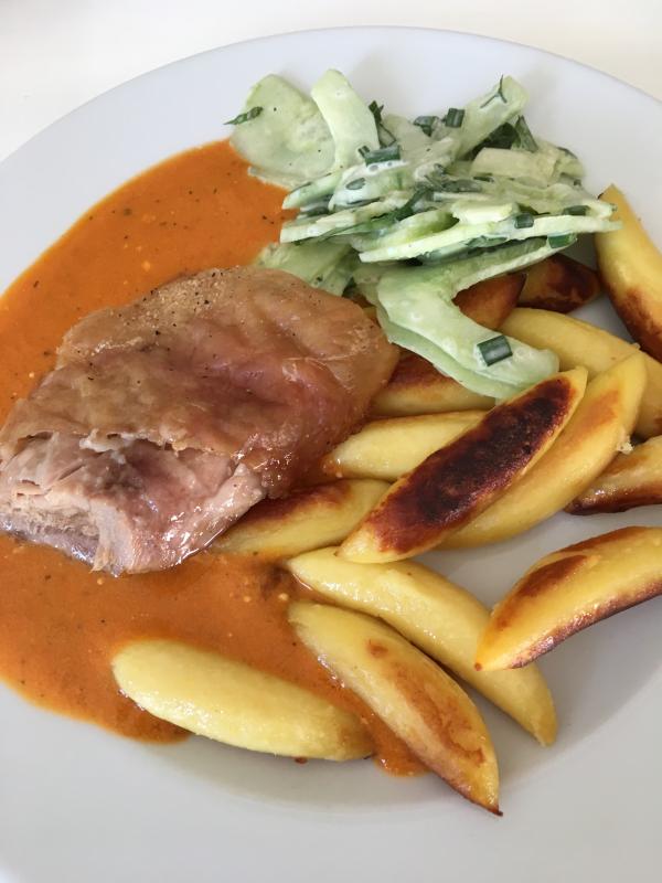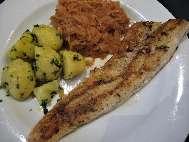 Hier gab es burgenländisches Paradeiskraut (Kraut aus dem oberen Waldviertel, frische Paradeiser aus dem Kamptal, also unteres Waldviertel) mit Petersilerdäpfeln (WV) und Zander (leider aus Kasachistan).