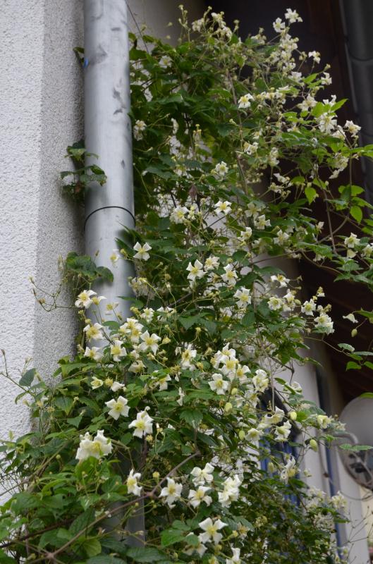 Auf der anderen Hausseite haben wir ein System aus grünen Stangen und Bindungen unmittelbar am Rohr, das bis ganz nach oben reicht. Da wächst Clematis fauriei 'Campanulina Plena' und ist inzwischen am Dach angekommen.