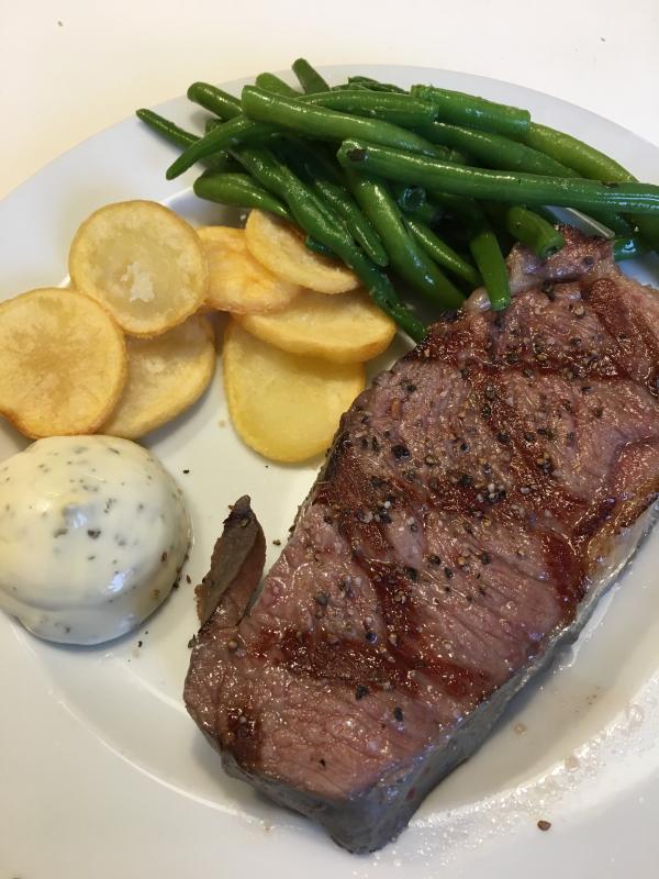 Gestern Rostbraten mit frittierten Kartoffelscheiben und grünen Bohnen