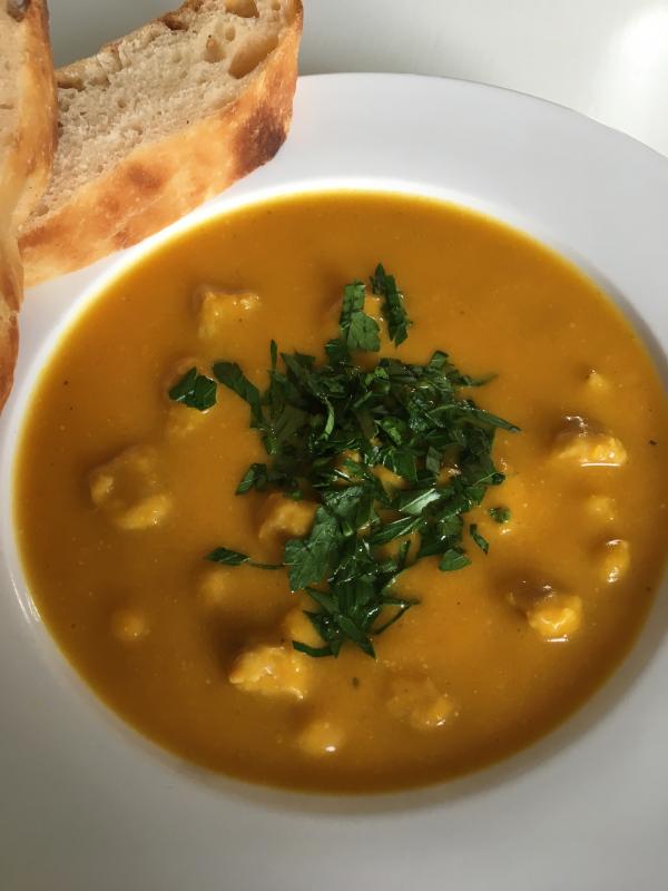 Heute die erste Kürbissuppe der Saison aus ofengebackenem Butternut, orientalisch gewürzt mit Kreuzkümmel und frischem Kurkuma. Drin waren Kichererbsen und kleine Hackfleischklöschen. Drüber glatte Petersilie. Dazu gabs Fladenbrot. Sehr gut :D
