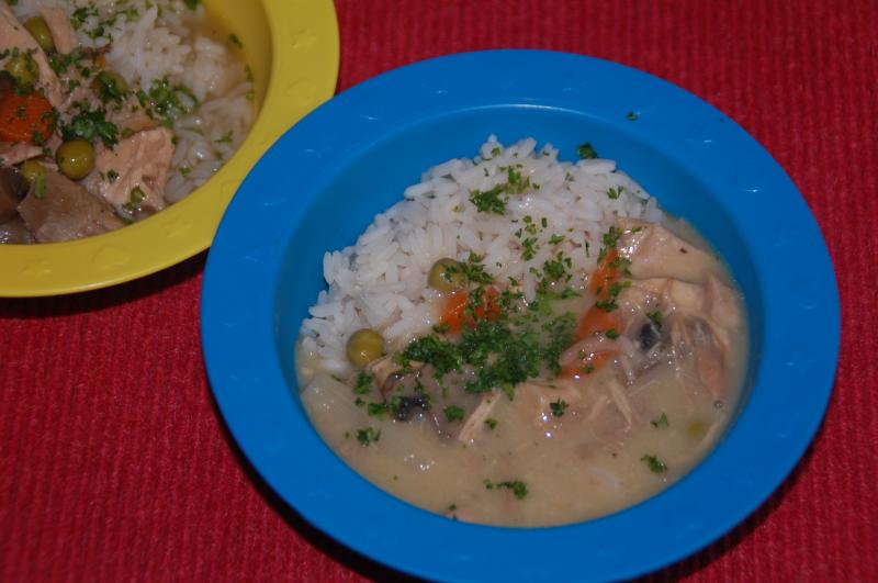 Reis und Hühnerfrikassee (Hahn (eigene Ernte), Möhre, Erbsen, Champignons, Spargel, Eigelb, Mehl, Butter, Sahne, S&P, Petersilie)