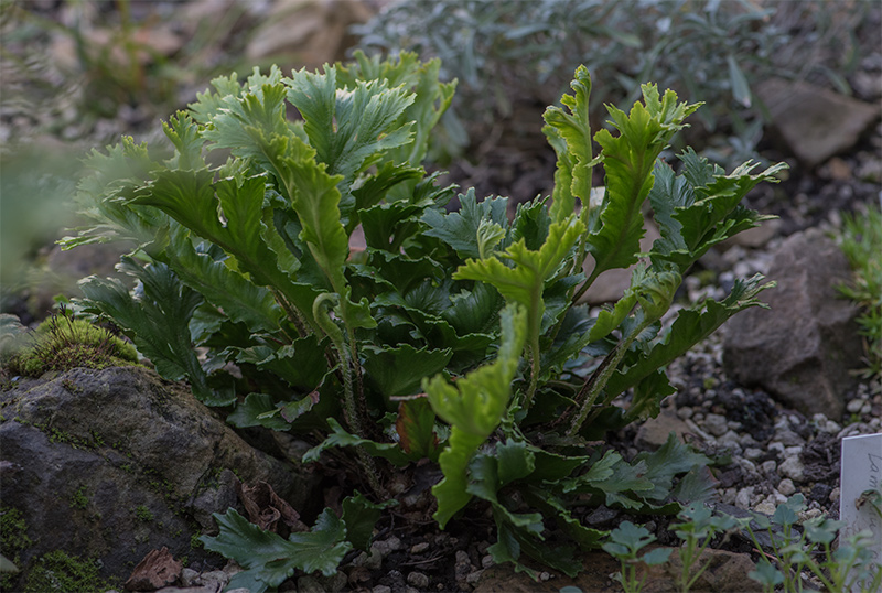 Es soll eine neue Selektion sein. Die Stiele sind schwarz, bei den zwei Pflanzen vorher blieben sie, wenn ich mich recht entsinne, dunkelgrün, auch am ausgewachsenen Wedel. Die zwei Exemplare vorher waren auch mit bis -12 winterhart ausgeschildert, hatten nach dem Winter arge Mühe, in die Gänge zu kommen, auch die nicht so kalten Winter der letzten Jahre setzen ihnen zu.