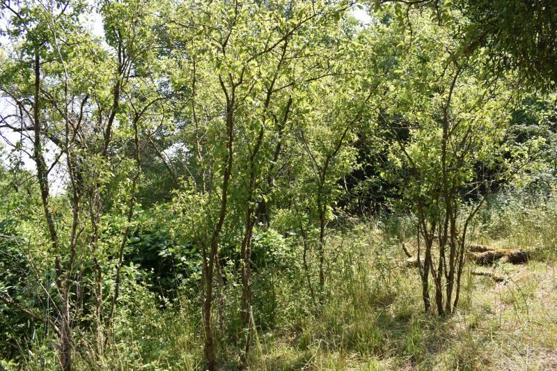 Wir haben auf einer Böschung am Ende unseres Grundstücks eine recht wilde Wildobsthecke, 20 m lang. Die Böschung ist etwa 1,50 hoch - so viel liegt das Nachbargrundstück höher - und recht steil, nur etwa 2 m breit. GG hat daher an den Fuß der Böschung große Granitsteine verbaut, sonst würde sie zu sehr abrutschen. Außerdem wird der Boden durch eine Mischung von Giersch und Efeu festgehalten. Vorgefunden haben wir dort einen großen Rambler, 2 Eiben, Liguster, 2 Haferschlehen und einige Mahonien. Der Rambler wächst vor allem an dem sehr hohen Zaun (4,50 m), hängt aber auch in einer Haferschlehe. Ergänzt haben wir das mit einem Pfaffenhütchen, einer Kornelkirsche, einem Hartriegel, einer Felsenbirne und einem Zierapfel. Für uns ist das ok, wenn das alles ineinander wächst. Nach mittlerweile 12 Jahren ist das ein 6-7 m hoher, recht dichter Wall. Bei einem kleinen Grundstück wäre das vermutlich zu mächtig. Es ist dort auch recht schattig.