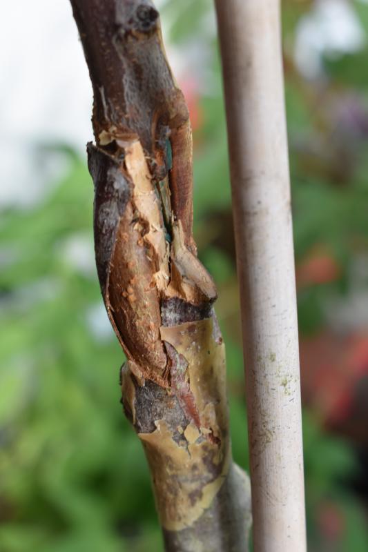 Die Veredlung schaut nicht gut aus, im Herz der Unterlage ist ein Spalt, die Rinde löst sich, Holz ist morsch, zersetzt sich.