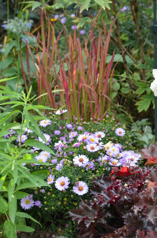 Jule, ich denke ebenfalls, dass Du dort nur etwas höheres als Übergang zwischen Geranium und Astern brauchst. Gelb fände ich zu schrill an der Stelle. Wenn Du die Asternblütezeit verlängern willst: 'Purple Dome' hätte die richtige Höhe und macht perfekte halbkugelig Büsche. :) Sie beginnt hier gerade die ersten Knospen zu öffnen. Dazu paar Gräser, Hosta...