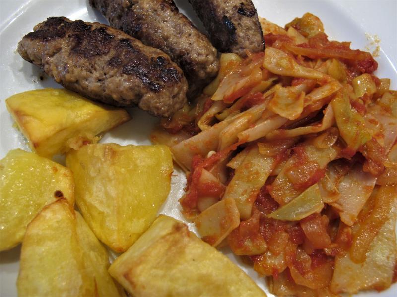 Ja. Ich finde den Tierbezug irgendwie halbherzig. Lieschens Kunstwerke zeigen doch, daß es durchaus auch ohne geht ;) Hier gab es gelbe Butterbohnen auf Balkanart (viel Zwiebel und Tomaten), Ofenkartoffeln und Cevapcici.