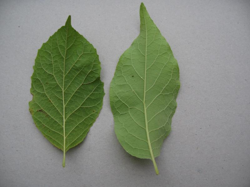 Ein Bild zum Vergleich Blatt von Halesia diptera var. magniflora und Halesia monticola: