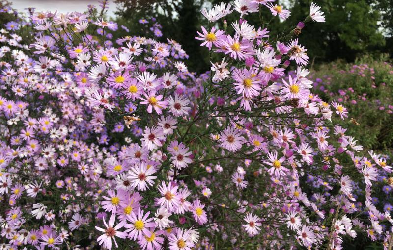 Das Riesenteil im Hintergrund ist 'Arcturus’, eine der wenigen Sorten, die sich in dem Gewühl absetzt. Dunkle Stiele! Und sie produziert wunderschöne Sämlinge, die meisten bisher leider mehltauanfällig.